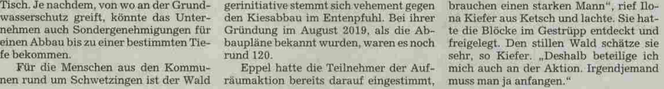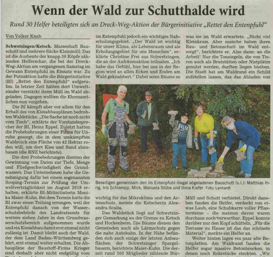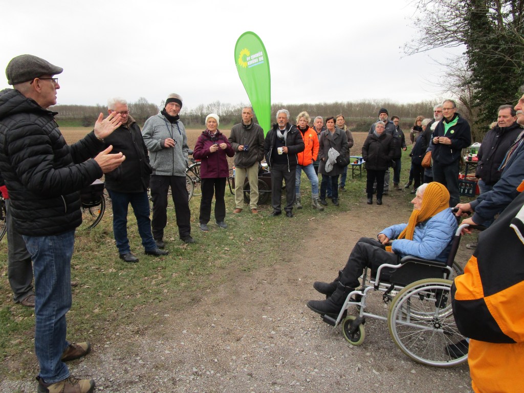 Die Teilnehmer des Treffens hörten es mit Freude. Die Runde diskutierte über eine nachhaltige Rohstoffnutzung zum Schutz der Wälder und über das Thema Windkraftanlagen. Baumann plädierte für eine klimafreundliche Rohstoffgewinnung und eine nachhaltige Baupolitik. Ziel sei, den Betonbau zu reduzieren und mehr Recyclingbeton zu verwenden. Das Land habe längst ein Konzept für eine nachhaltige Gewinnung und Nutzung mineralischer Rohstoffe. Das könne sogar in den örtlichen Bebauungsplänen festgelegt werden, warf Baumann manchen Gemeinden vor, hier „verlogen“ zu sein: „Gegen den Kiesabbau sein, aber in den Gemeinderatssitzungen die Bebauungspläne mit klimaschädlichem Beton dann durchwinken.“ Um Ökologie und Ökonomie zusammenzubringen, brauche man in den nächsten Jahren bei den Windrädern „einen massiven Zubau“ für die Energieversorgung. Zwischen drei und fünf moderne Windräder könnten im Entenpfuhl errichtet werden. Im Wahlkreis gebe es nur eine geeignete Fläche für Windkraftanlagen und dieses Areal reiche vom Wald bis zu den Äckern bei Ketsch. Die Windräder, ein halber Hektar pro Anlage reicht, könnten dann die Bürger hier mit Strom versorgen. BI-Vorstand Werner Zieger sind eineinhalb Hektar Rodung natürlich lieber als die 42 Hektar im Falle eines genehmigten Kiesabbaus. „Windräder zerstören keinen Lebensraum“, bekräftigte Baumann.